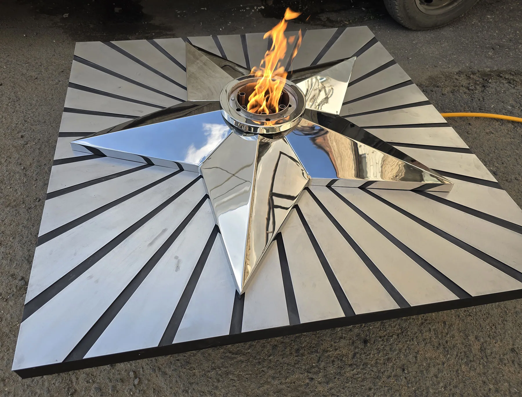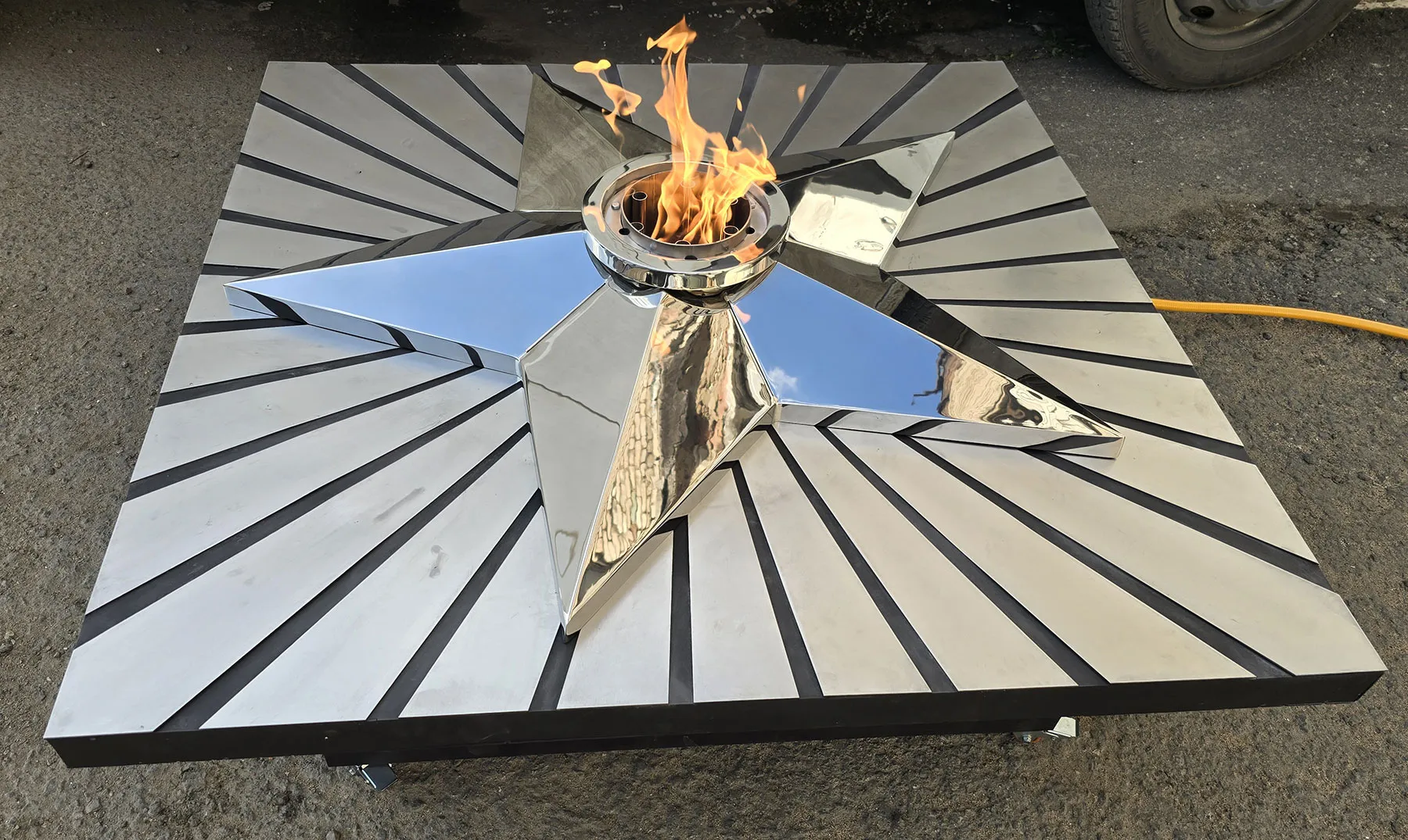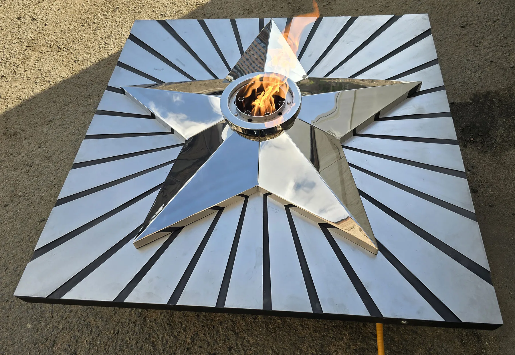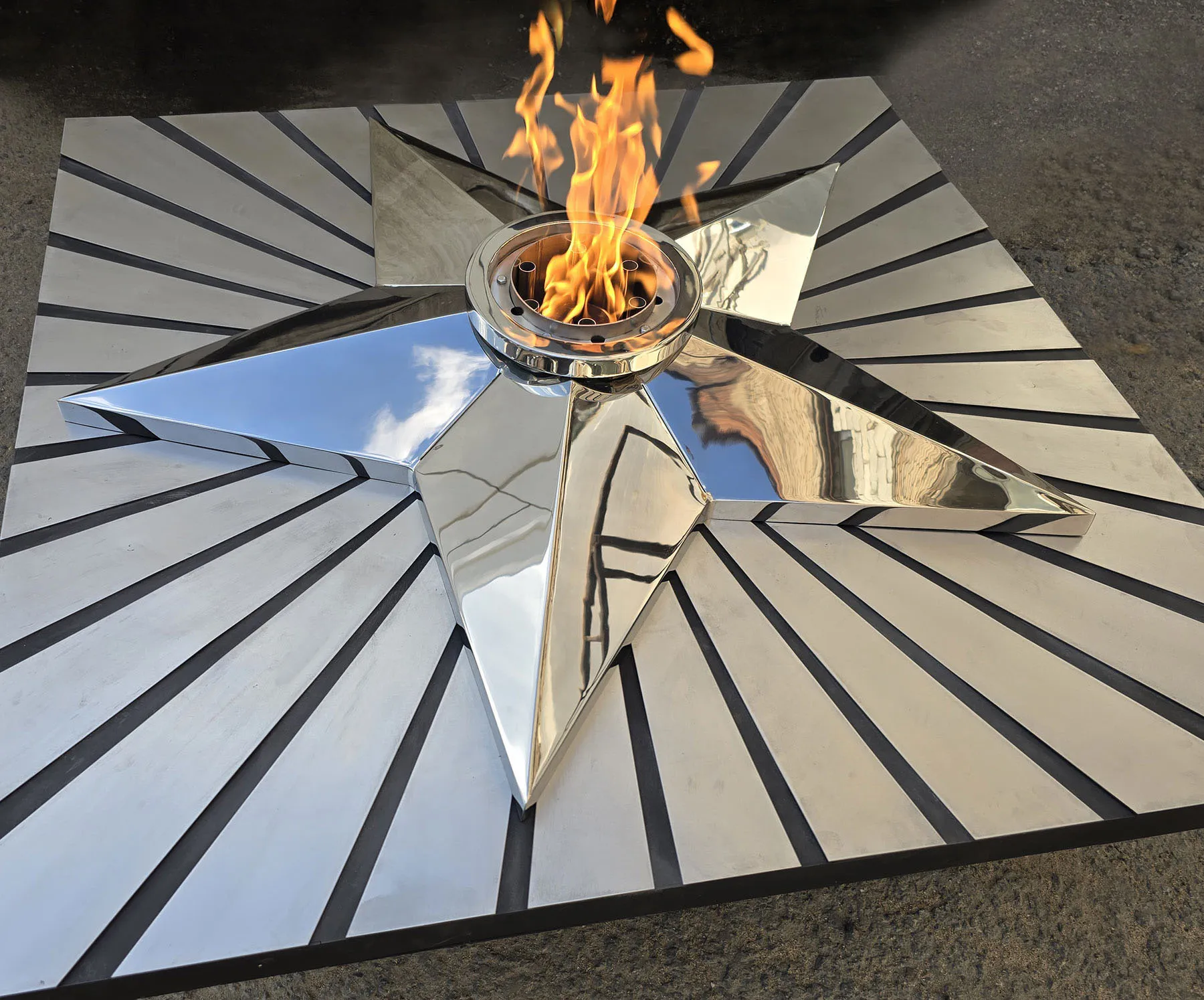 Мобильная группа оборудования «Вечный огонь» - это действующая модель настоящего вечного огня. Компактные размеры и небольшой вес позволяют использовать изделие в формате выездного мероприятия. Высота пьедестала 350 миллиметров, габариты пьедестала по верхнему срезу 1200 хь1200 мм. Модель оснащена устройством искрового розжига пламени, работает розжиг по нажатию пусковой кнопки на передней панели изделия. Топливо – сжиженный газ (пропан), гибкая линия подвода газа позволяет вынести баллон с газом на расстояние до 50 метров от места расположения самого мобильного модуля. Оборудование сертифицировано, безопасно и функционально. Для работы модуля используется газовая ветроустойчивая горелка модели ГВД 379 10 89 00 ПС. Изделие производится и поставляется в продажу группой компаний NSO-PiroClub
