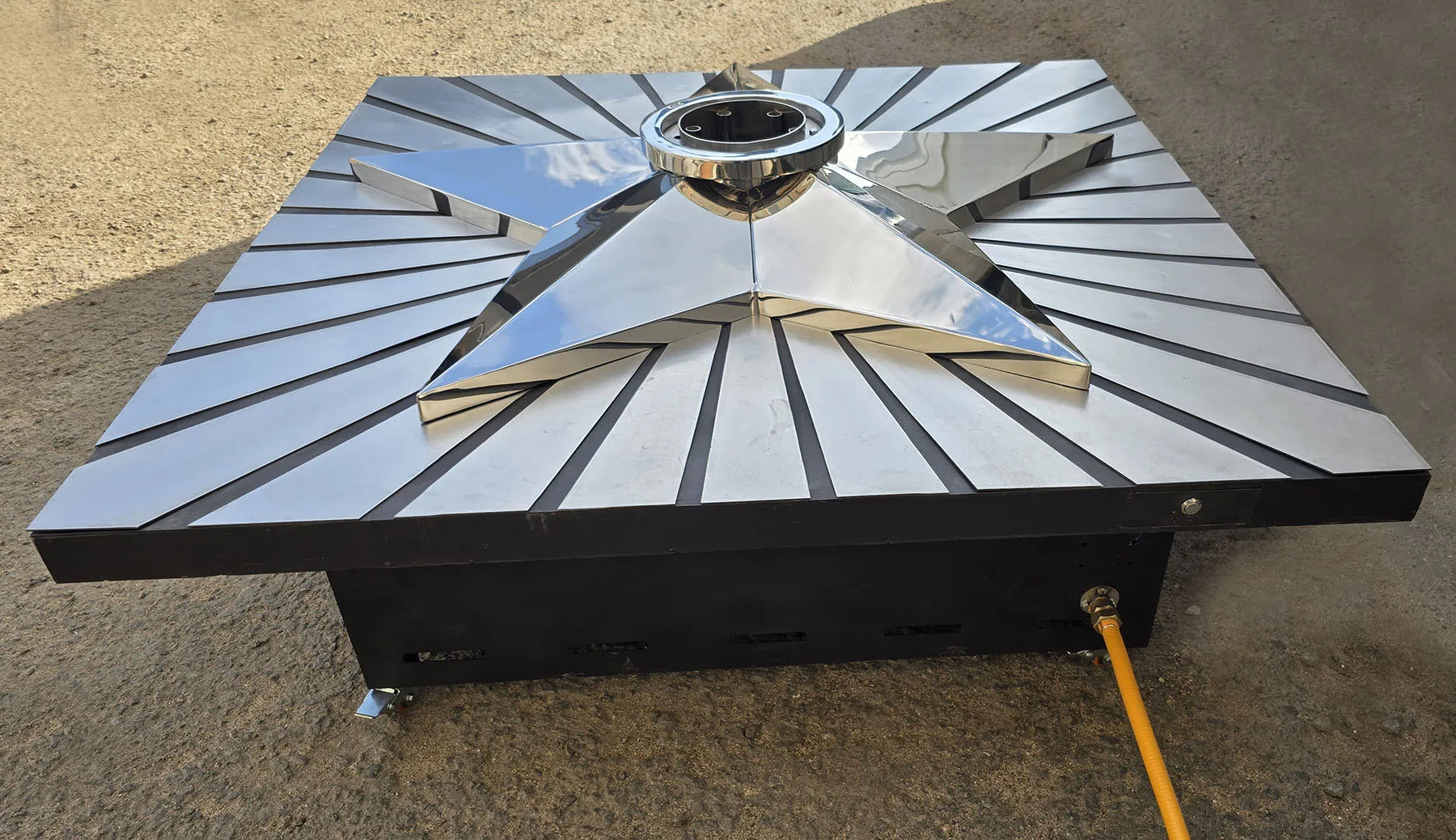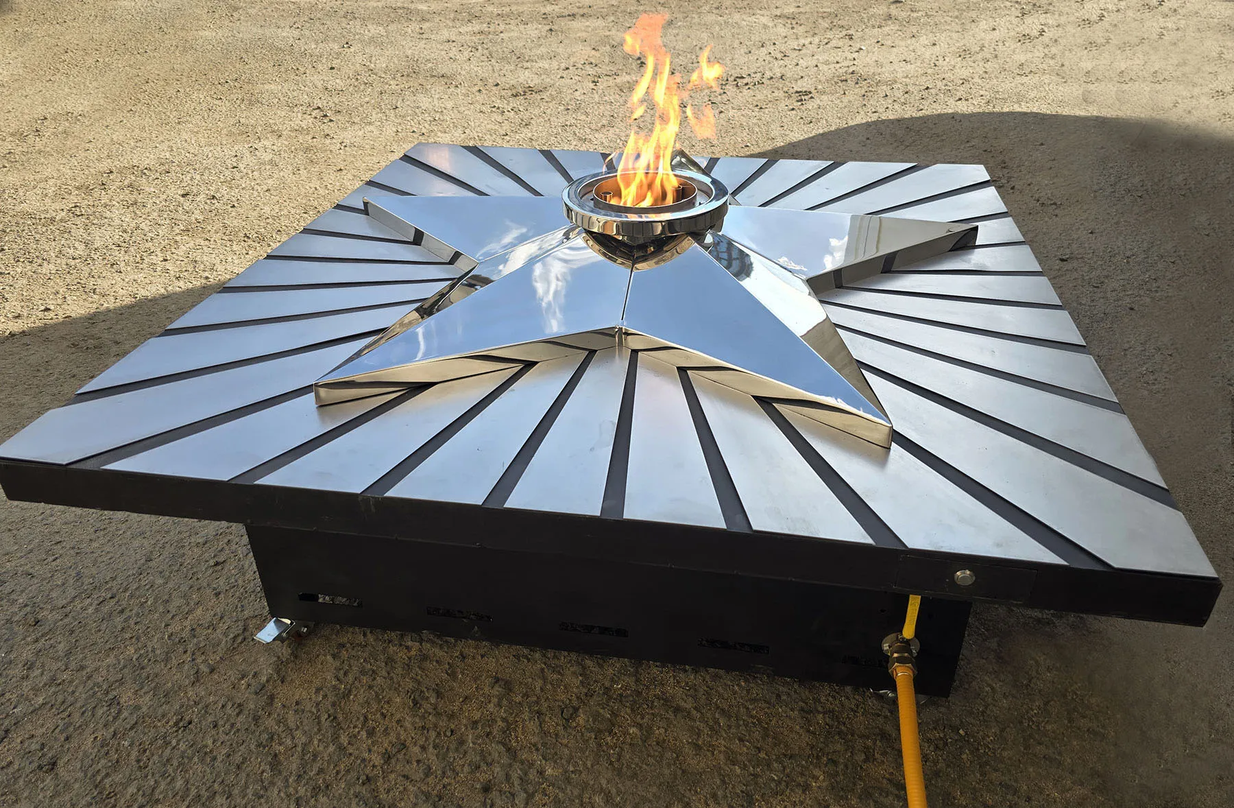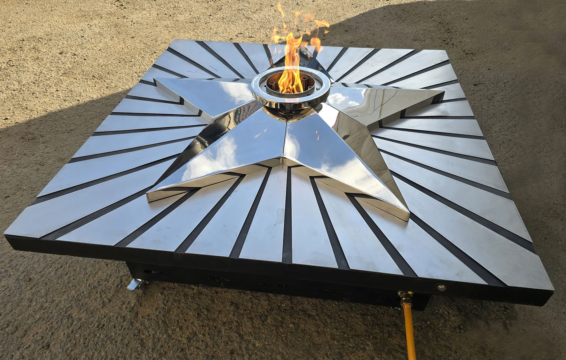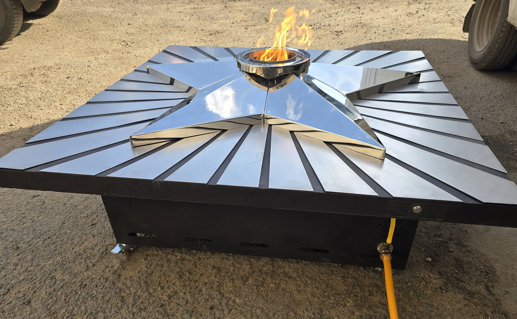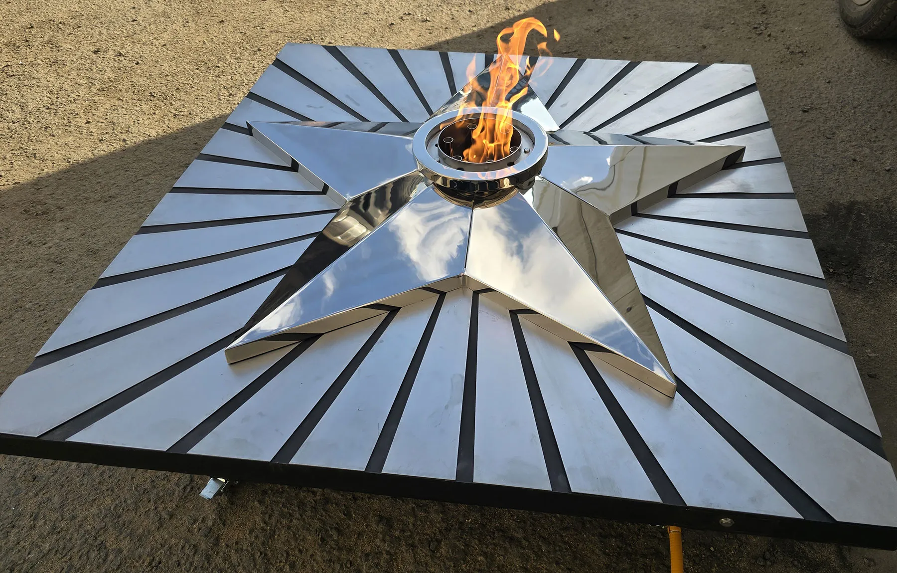 Мобильная группа оборудования «Вечный огонь» - это действующая модель настоящего вечного огня. Компактные размеры и небольшой вес позволяют использовать изделие в формате выездного мероприятия. Высота пьедестала 350 миллиметров, габариты пьедестала по верхнему срезу 1200 хь1200 мм. Модель оснащена устройством искрового розжига пламени, работает розжиг по нажатию пусковой кнопки на передней панели изделия. Топливо – сжиженный газ (пропан), гибкая линия подвода газа позволяет вынести баллон с газом на расстояние до 50 метров от места расположения самого мобильного модуля. Оборудование сертифицировано, безопасно и функционально. Для работы модуля используется газовая ветроустойчивая горелка модели ГВД 379 10 89 00 ПС. Изделие производится и поставляется в продажу группой компаний NSO-PiroClub